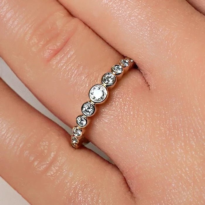 Gyűrűink 14 karátos fehéraranyból, sárgaaranyból vagy ezüstből készülnek, tanúsított laboratóriumi gyémántokkal. A lab-grown gyémántok valódi gyémántok, azonos kristályszerkezettel és ragyogással.